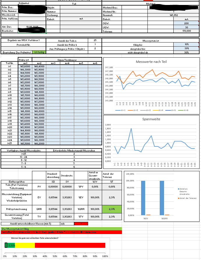 - Die Berechnung für die Part-to-Part Varianz ergab einen negativen Wert (-0.08055), da die Variabilität zwischen den Teil-Mittelwerten (MS_Teil = 0.2685) kleiner war als die Variabilität innerhalb der Teile (MS_Repeatability = 0.4296).