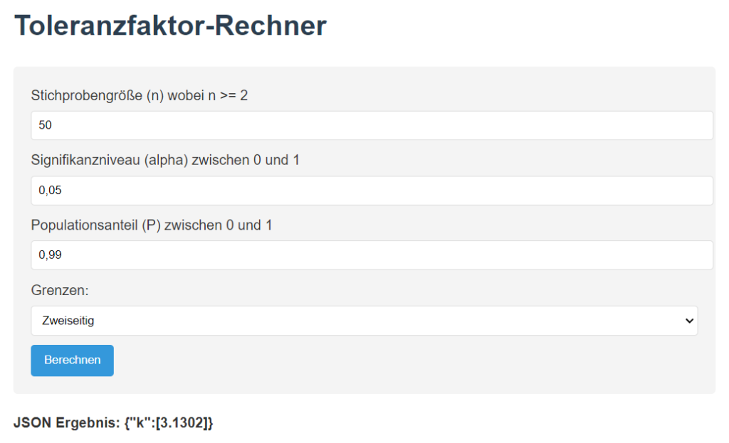 - Toleranzfaktor bestimmen: Wählen Sie den passenden Toleranzfaktor (k) aus den Tabellen der ISO 16269. Dieser hängt von der Stichprobengröße, dem gewünschten Konfidenzniveau und dem Anteil der Population ab, der innerhalb der Grenzen liegen soll.